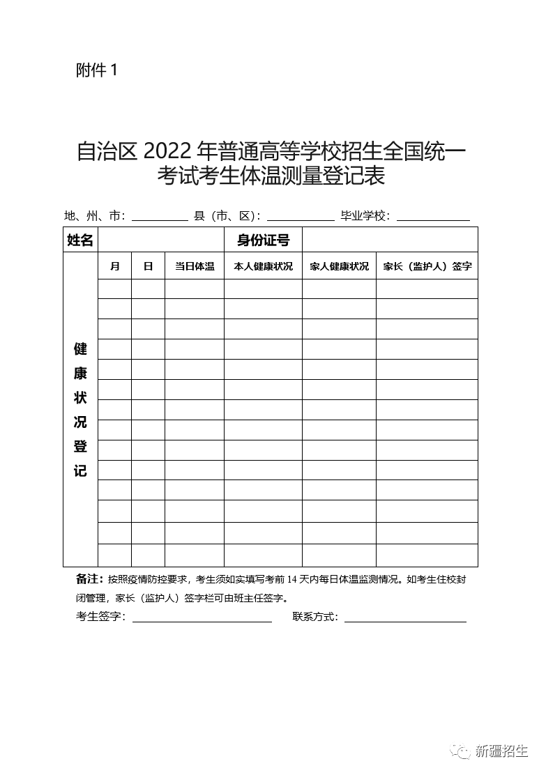 附件:1.自治区2022年普通高等学校招生全国统一考试考生体温测量登记表