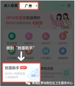 2、选择“广州”地区,点击医鹿APP首页 “成人疫苗” ,进入页面后再点击“抢苗助手”。