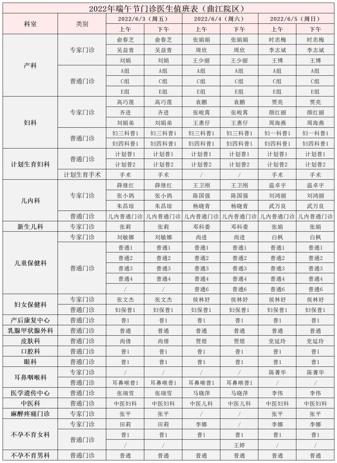 曲江院区门诊值班表