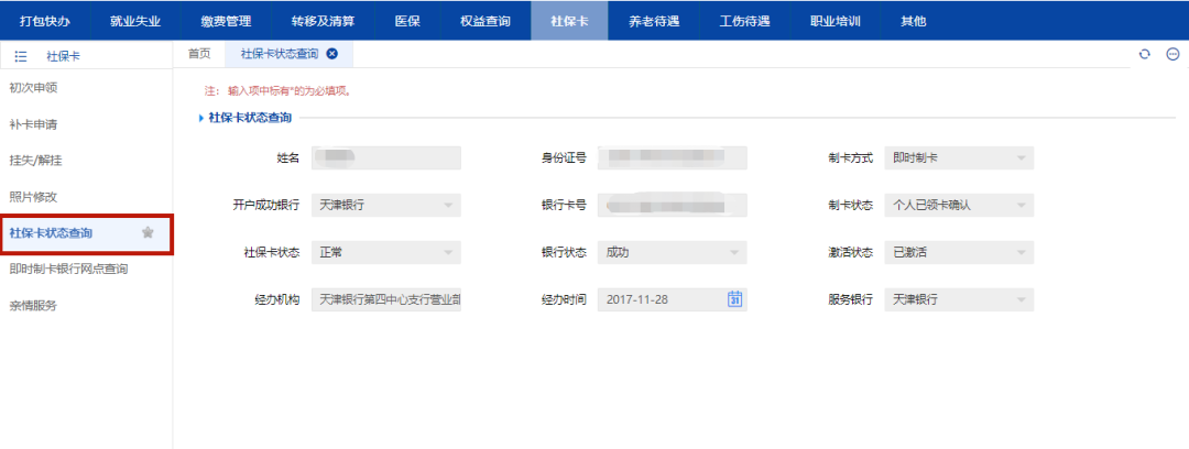 >>>天津社保卡状态查询