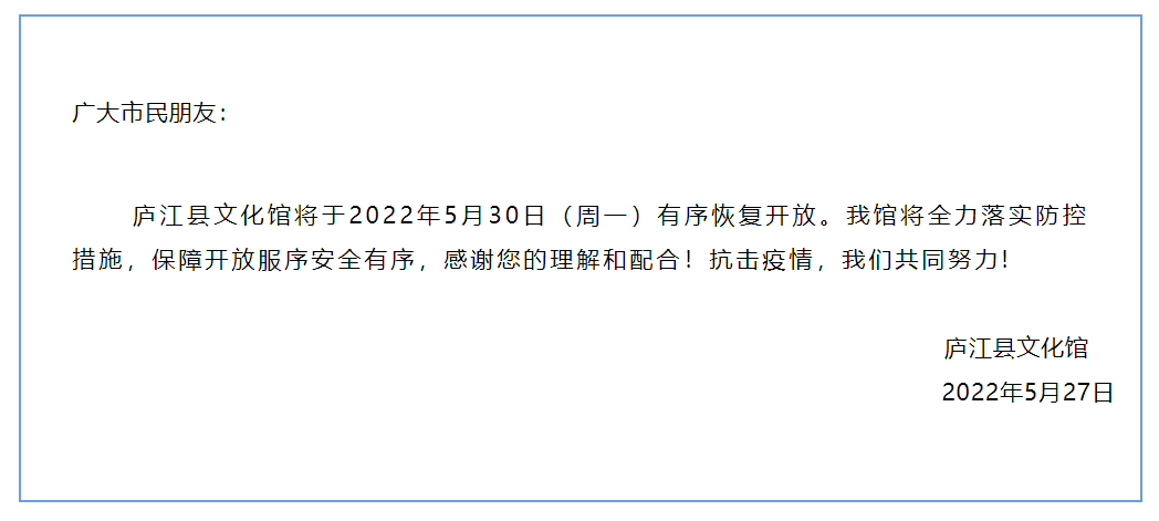庐江县文化馆将于2022年5月30日(周一)有序恢复开放。我馆将全力落实防控措施,保障开放服序安全有序,感谢您的理解和配合!抗击疫情,我们共同努力!