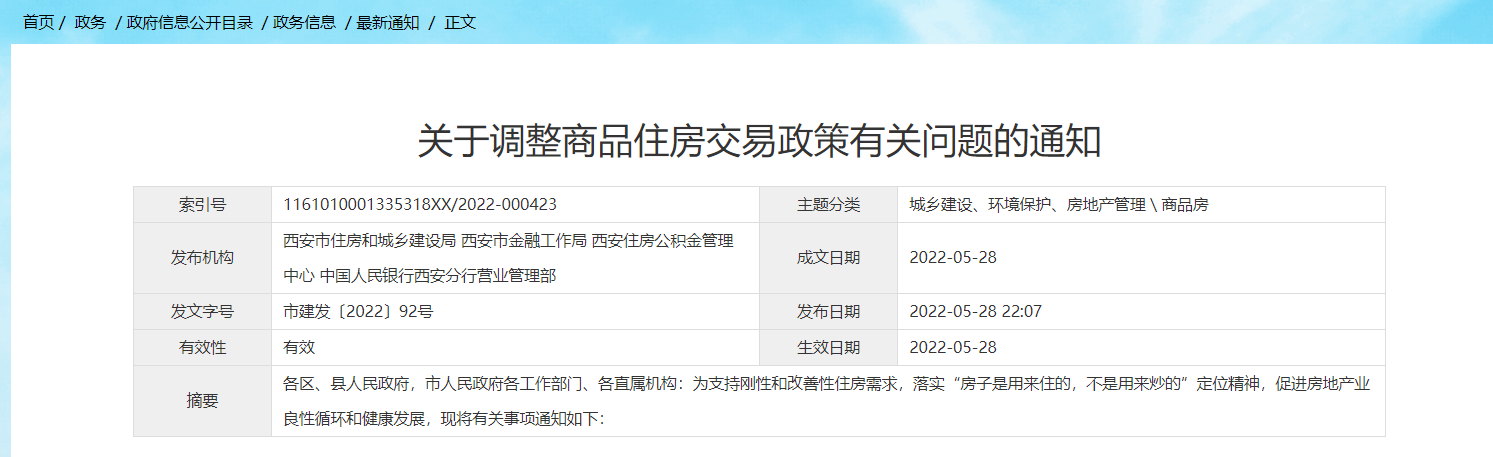 2022年5月28日,西安住建局发布调整商品住房交易政策有关问题的通知。