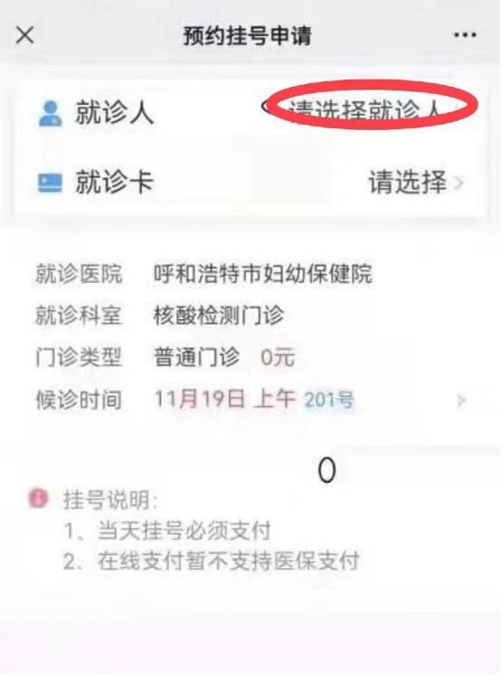 第三步,选择就诊人,完善信息并保存,提交后零元支付(此支付为预约支付)生成预约码。
