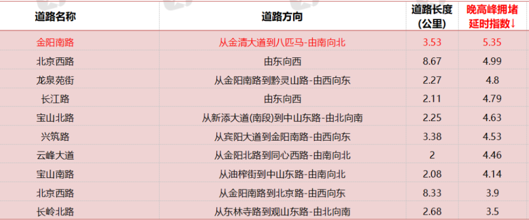 6月8日晚高峰,金阳南路、北京西路、龙泉苑街、宝山路、云峰大道等道路拥堵指数较高。