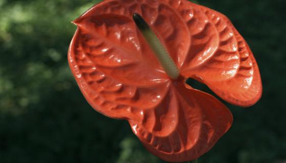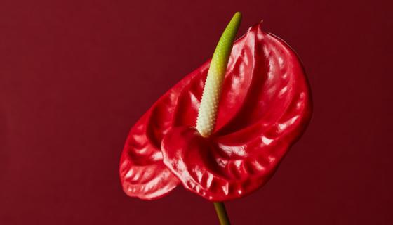 红掌的花语是热情、热血、大展宏图等。红掌是热带切花,佛焰花序,其佛焰花苞硕大,肥厚具蜡质,色泽有红、粉、白、绿、双色等。红掌有如一只伸开的红色手掌,在掌心上竖起一小条金黄色的肉穗,所以也被叫做“佛焰苞”。红掌花期长,切花水养可长达1个月,切叶可作插花的配叶,做盆栽单花期可长达4~6个月。