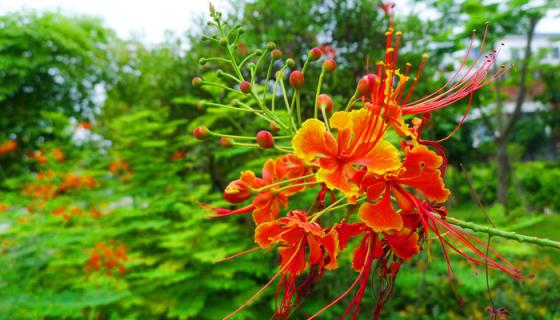 凤凰花的花语是:火热的青春、吉祥快乐、思念离别等。凤凰花一年只开两季,一个是在五月,那时正是许多人面对离别的时候,尤其是校园里凤凰花开的时候,就代表着有人即将离开。凤凰花第二次开花是在九月,九月是相聚的季节,五湖四海的人聚在一起,成为朋友。所以凤凰花还有相知相遇的意思。